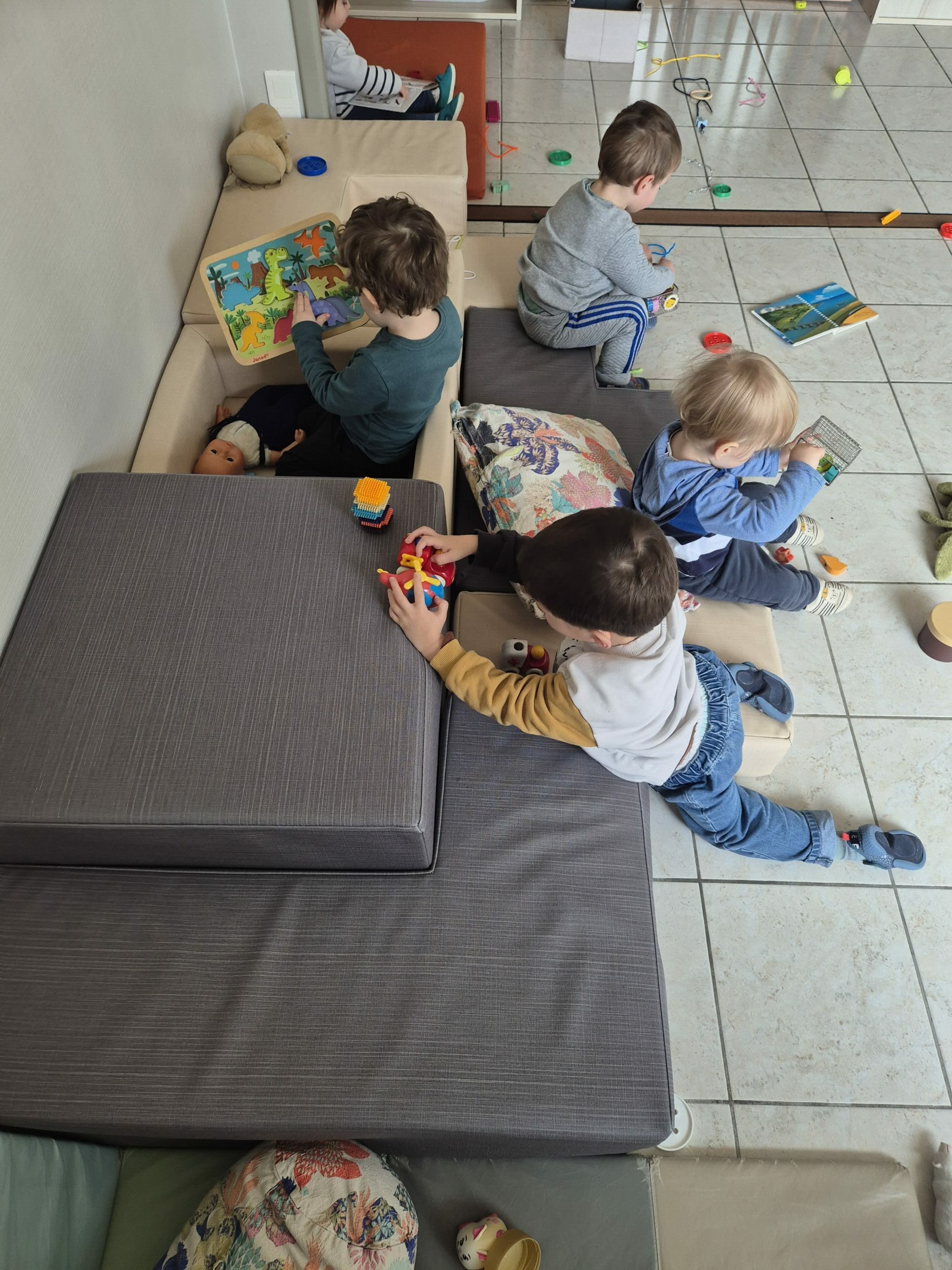 Un espace bébé est aménagé avec soin pour lui permettre de se déplacer librement et en sécurité. Des objets à manipuler et en lien avec ses goûts du moment sont installés pour lui permettre de développer ses expériences et multiplier ses découvertes.